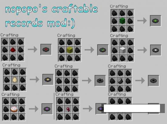 Пластинки – это предметы, которые позволяют проиграть определенную мелодию, записанную на них. Для старта проигрывания необходимо создать проигрыватель и добыть необходимую пластинку.