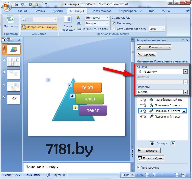 Примечание: Если скопировать блок-схему с примененным к ней эффектом анимации на другой слайд, эффект также будет скопирован.