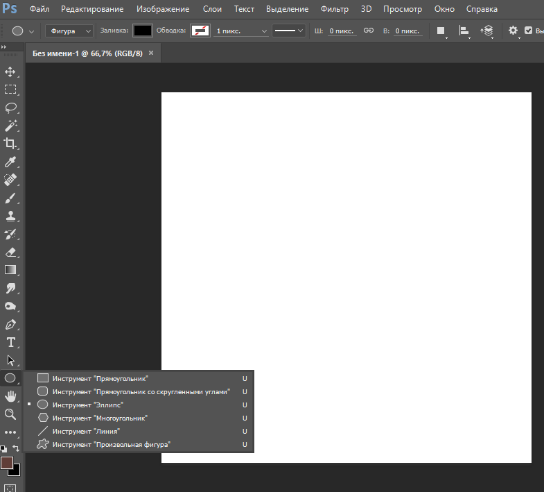 Чтобы создать фигуру на холсте, щелкните мышью и перетащите ее до нужного размера. Чтобы сохранить пропорции, удерживайте Shift при перетаскивании. Вы можете изменить цвета Fill и Stroke на панели параметров .