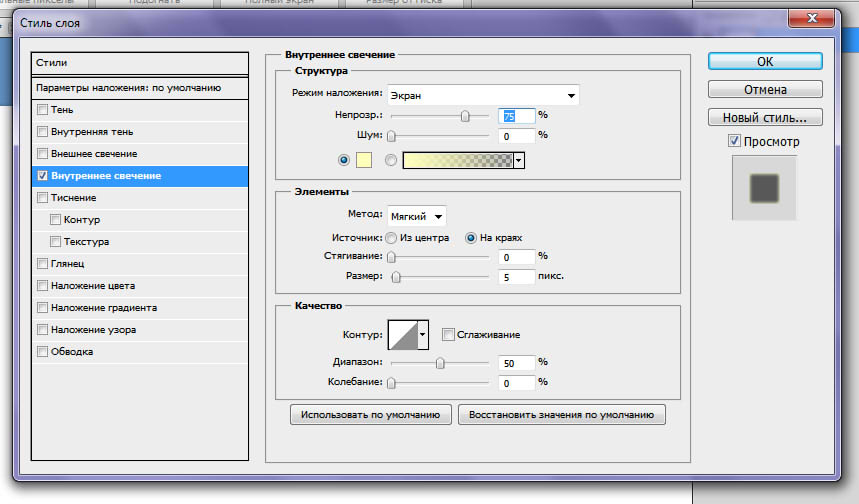 В разделе «Элементы» вы увидите параметр для параметра «Источник», который должен быть установлен либо в центр, либо в край. Изображение, показанное ниже, настроено на Edge. Вы также захотите поиграть со значениями Choke и Size . Когда ваше внутреннее свечение выглядит хорошо, нажмите OK.