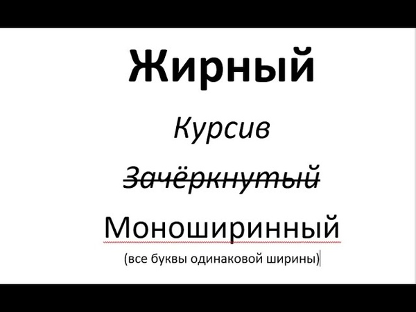 Под начертанием следует понимать толщину (жирность), наклон букв (курсив), подчеркивание, перечеркивание символов. Эти параметры можно задавать отдельно или вместе друг с другом. Например, полужирный курсив или подчеркнутый индекс.