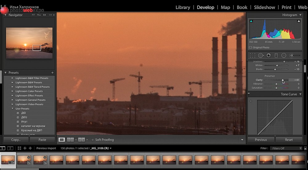 1. Импортируем снимки в программу Adobe Lightroom и редактируем одно из изображений. Для этого лучше взять кадр из середины получившейся цепочки. Когда все необходимые параметры будут выставлены, копируем их на остальные снимки.
