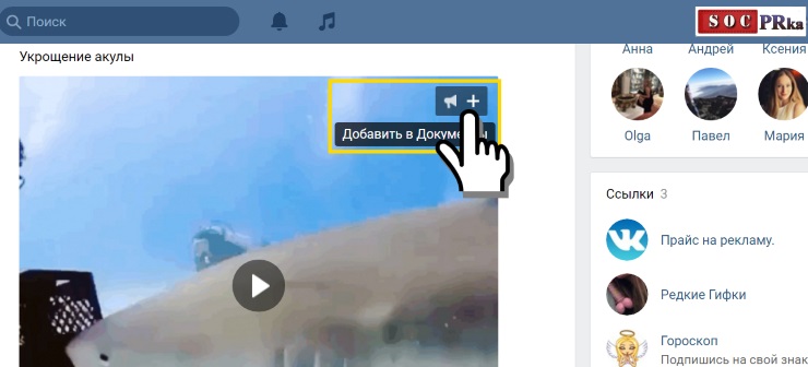 Чтобы сохранить гифку из Вконтакте нужно добавить ее к себе в документы, нажав на «+» на картинке -> перейти в «Документы» (слева в меню) -> сохранить необходимый документ.