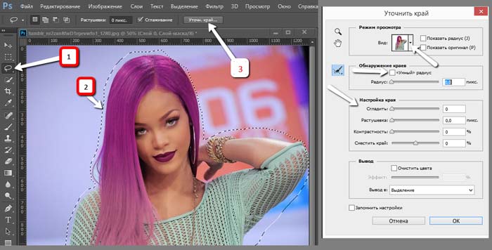- Несмотря на то, что инструмент быстрого выделения отлично справляется с определением краев, он не лишен недостатков. Вам нужно будет внести несколько изменений в свой выбор. Перечисленные ниже элементы управления могут помочь вам в точной настройке краев.