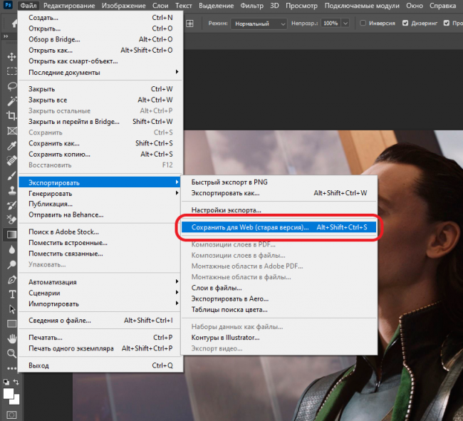 1. Меню Файл / File — Экспорт / Export — Сохранить для Web / Save for Web (горячие клавиши Ctrl + Shift + Alt + S).