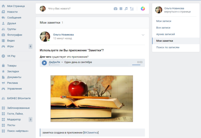 Как и при создании Граффити или Опроса, теперь к заметке можно прикреплять любые элементы, доступные в записи. То есть написать саму запись, добавить фото, видео, аудио, добавить опрос или прикрепить граффити. Можно так же и оставить только заметку, без дополнительных элементов. Не забываем нажать кнопку «Отправить».