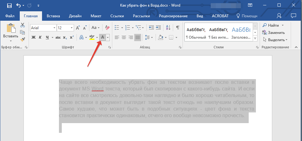 - Π ΠΏΡΠΎΠ³ΡΠ°ΠΌΠΌΠ΅ MS Word ΠΎΡΠΊΡΠΎΠΉΡΠ΅ Π²ΠΊΠ»Π°Π΄ΠΊΡ Β«ΠΠ»Π°Π²Π½Π°ΡΒ», Π² Π³ΡΡΠΏΠΏΠ΅ Β«Π¨ΡΠΈΡΡΒ» Π½Π°ΠΆΠΌΠΈΡΠ΅ Π½Π° ΠΊΠ½ΠΎΠΏΠΊΡ Β«Π¦Π²Π΅Ρ Π²ΡΠ΄Π΅Π»Π΅Π½ΠΈΡ ΡΠ΅ΠΊΡΡΠ°Β».