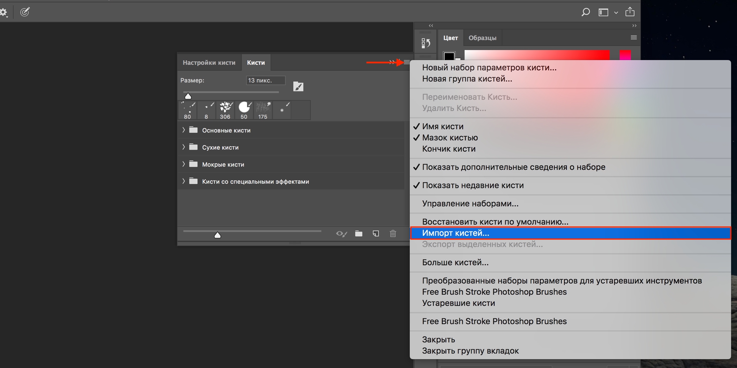Существует несколько способов импорта кистей в пресеты Photoshop. Один из способов — использовать Диспетчер пресетов кистей. Другой способ — использовать библиотеку кистей.