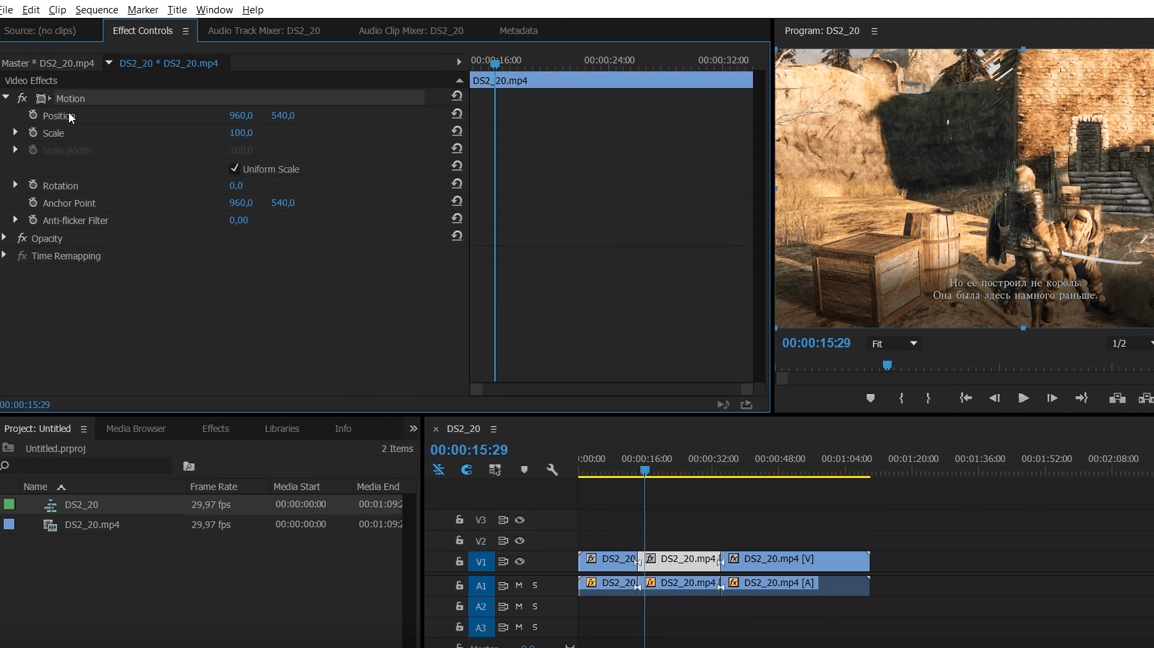 Это стандартные элементы управления, уже примененные к вашим клипам в Premiere. К ним относятся элементы управления движением клипов (положение, масштаб, вращение и опорная точка), непрозрачность и переназначение времени.