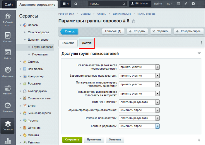 На момент перехода по данной ссылке вас перенесёт на страницу, где у вас появится возможность изменения названий и уровней доступа ко всему функционалу данной группы: