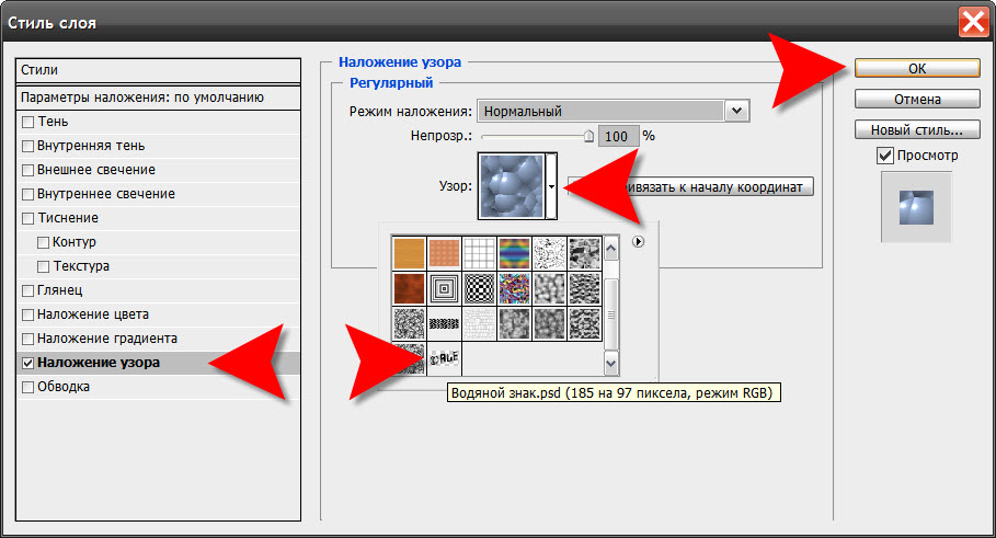 Если вы хотите применить узор для любого выбранного слоя, двойным кликом по миниатюре этого слоя откройте окно «Стили слоя» (Layer Style) . Почти в самом низу найдите параметр «Наложение узора» (Pattern Overlay) и активируйте его.
