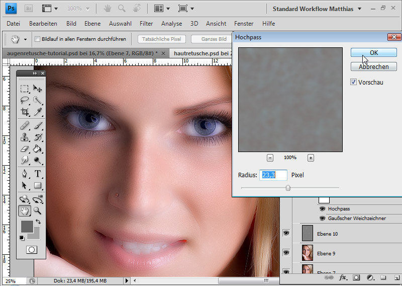 Ради интереса, засеките, сколько времени займет обработка у вас. При классической ретуши методом частотного разложения у вас на это ушло бы не менее 40 минут!