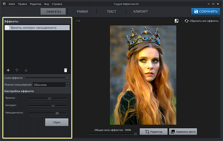 Регулировка контрастности работает аналогично, а при максимальном значении и при включённой опции «Использовать прежние» даёт интересный эффект: