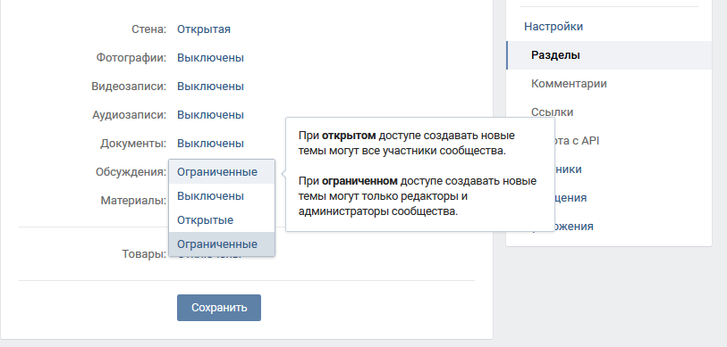 1. Как обычно переходим в раздел «Управление сообществом», открываем вкладку «Разделы» и включаем видеозаписи: