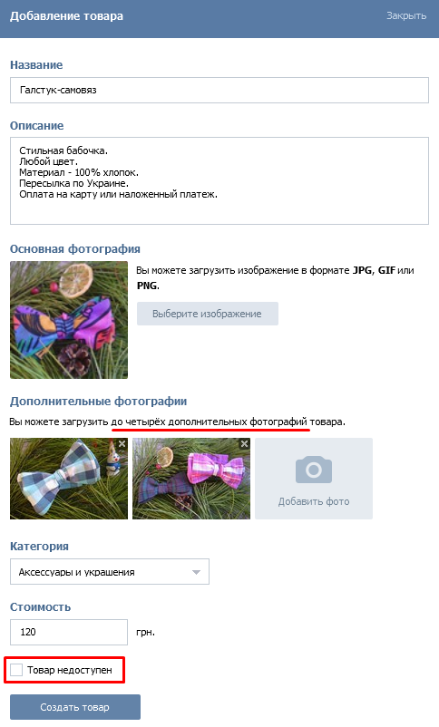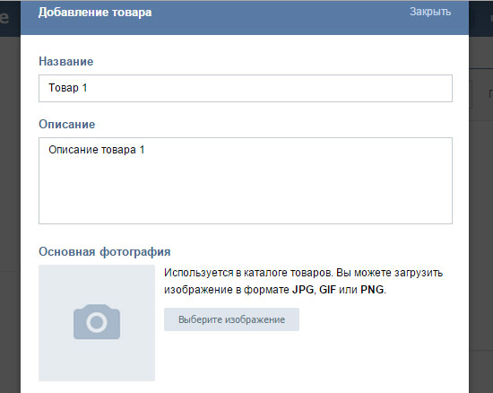 Пройдите в раздел Товары и в правом верхнем углу нажмите Добавить товар и заполнить карточку товара. В поле «Категория» укажите категорию товара из предложенного списка. Это необходимо для размещения товаров в едином каталоге ВКонтакте.