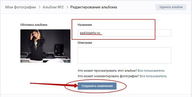 Кроме того, тут можно включить и отключить комментарии. - Для сохранения изменений нажимаем левой кнопкой мышки по кнопке «Создать альбом«.