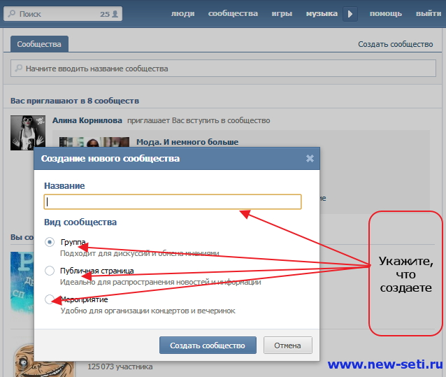 Выбираем тип сообщества и оформляем группу