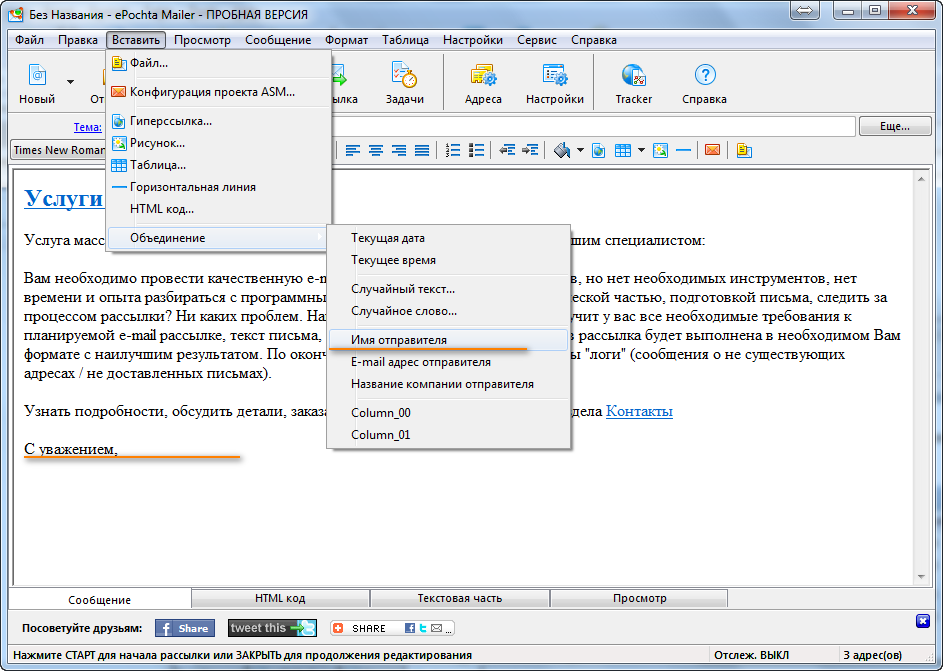 Остается подкорректировать содержимое письма, если это требуется. Просто перепишите тексты. Можно пользоваться инструментами оформления из верхней панели.