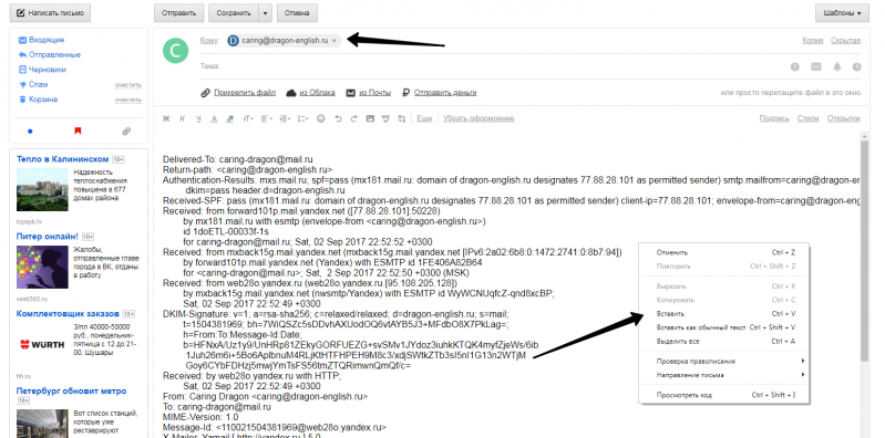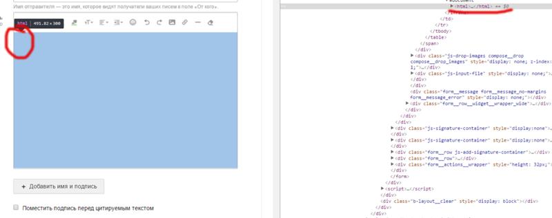 Нажмите правой кнопкой мыши на поле для ввода текста письма и выберите “просмотреть код” (В каждом браузере этот пункт называется по-своему, но смысл сохраняется). Откроется панель редактирования кода страницы. (Панель может отличаться визуально в зависимости от вашего браузера. Мы показываем на примере Google Chrome).