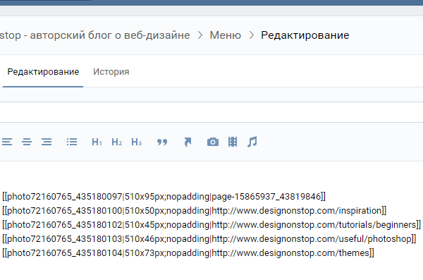 Теперь мы должны проставить ссылки для каждой картинки. Ссылку надо вставлять после nopadding| вместо пробела перед закрывающими скобками. Для первой картинки (шапка меню из Шага 1) можно дать ссылку на главную страницу группы, а можно воспользоваться свойством nolink (ставится через ; после nopadding без пробелов). Для второй картики вставляем адрес страницы формата