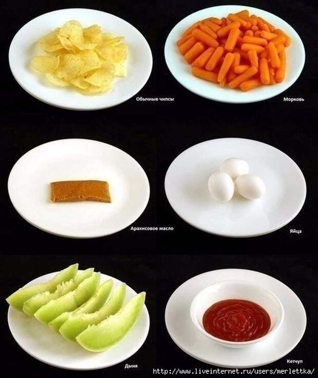 Все продукты сфотографированы с одинакового расстояния на одинаковой тарелке диаметром 26 см. Зная, что чайная ложка сливочного масла по калорийности равна полутора килограммам сельдерея, в следующий раз противостоять соблазнам будет проще! Удачи всем худеющим и просто последователям здорового образа жизни.