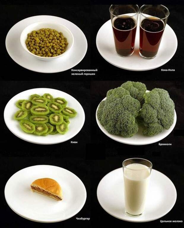 Иногда еда выглядит вовсе не такой питательной, как на самом деле. 200 калорий — это полкило брокколи или порция ликера, одинаковая калорийность, но такой разный размер!