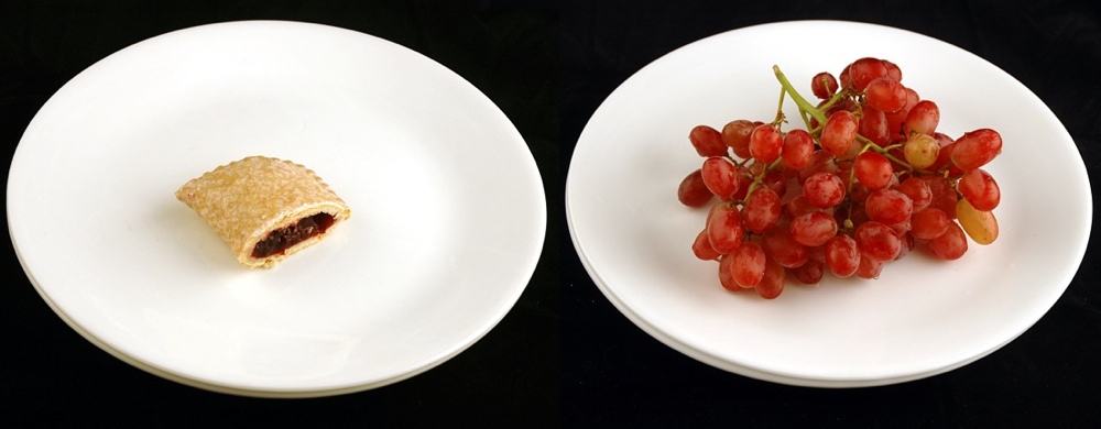 Все продукты расположены на одной и той же посуде: тарелка имеет диаметр 26см, а чаша 16см. Фотографии были сделаны тоже одним фотоаппаратом (Nikon D70). Посмотрите и подумайте, чтобы вы выбрали. Полную тарелку овощей или половинку чизбургера на обед? Как выглядят фрукты на 200 калорий