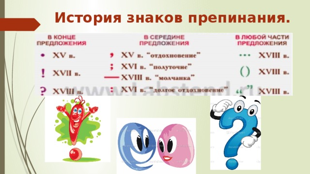 Древнейшим знаком препинания является точка. Она встречается уже в памятниках древнерусской письменности. Затем появилась запятая. Слово точка вошло в название таких знаков препинания, как точка с запятой ( ; ), двоеточие ( : ), многоточие ( … ).