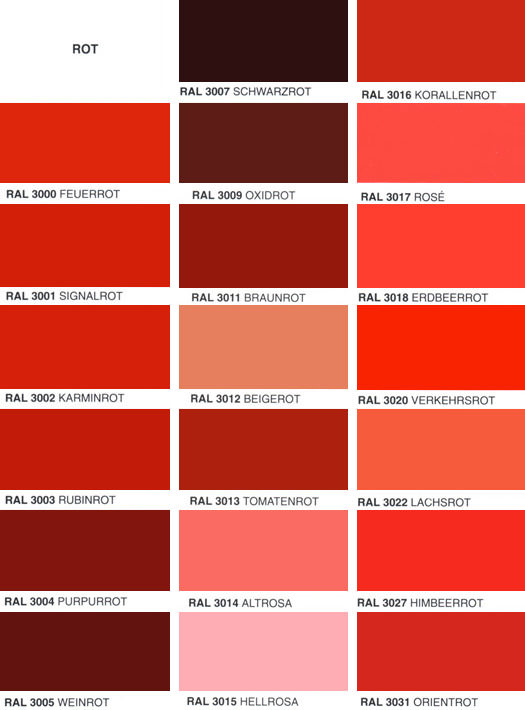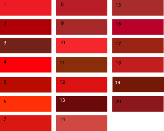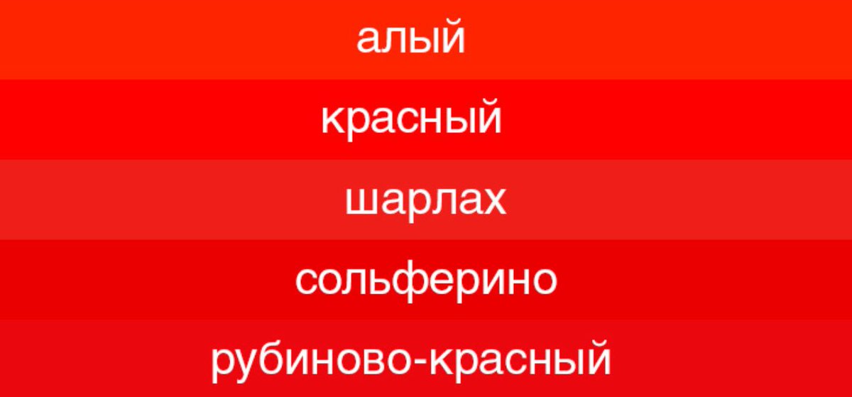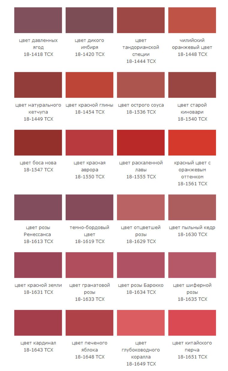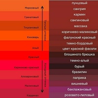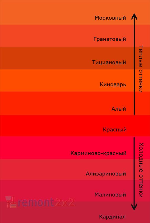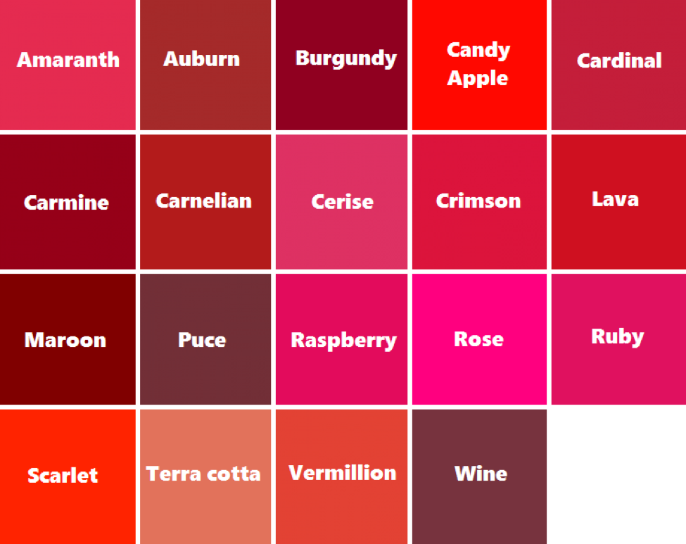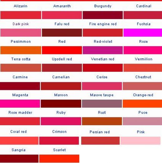 Алый. Ализариновый. Багровый. Розовый. Багряный. Кармин. Кардинал. Бардовый. Малиновый. Огненный. Красно – коричневый. Темно – красный. Вишневый.