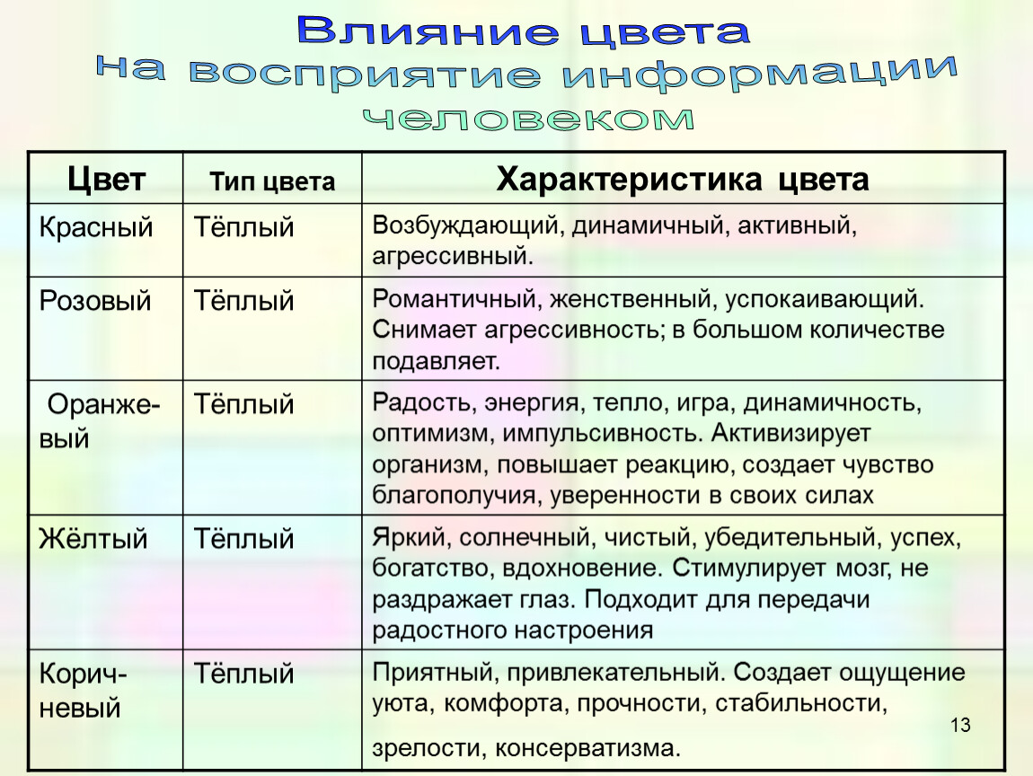 | Существует четыре основных психологических цвета: красный, синий, желтый и зеленый. Они относятся соответственно к телу, уму, эмоциям и существенному балансу между этими тремя. Психологические свойства одиннадцати основных цветов следующие ( Узнайте, как вы можете использовать положительные эффекты цветов, присоединившись к нам на одном из наших курсы ): | |
