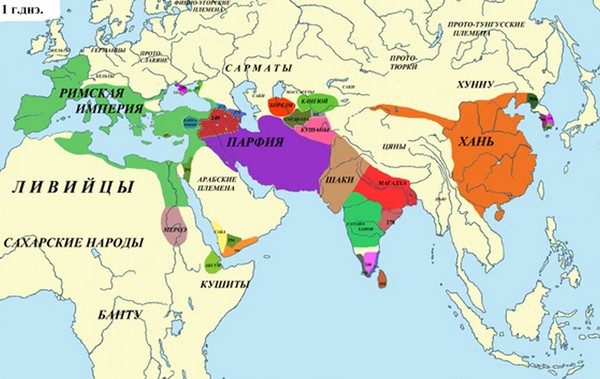 Интерактивный исторический атлас мира . Карта «Страны мира 01.01.001 г. н.э.». - Википедия. Статья об Индо-Парфянском царстве.