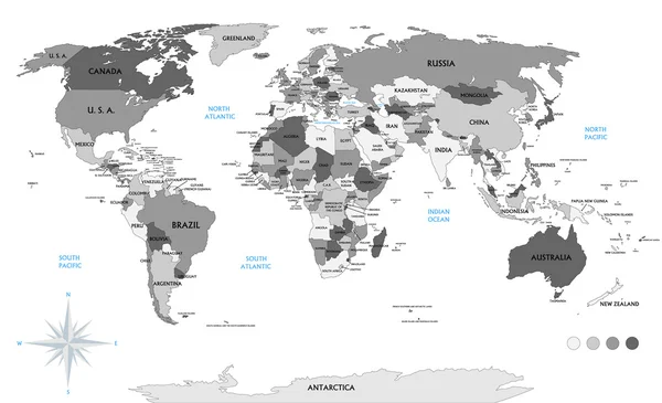 Для большей наглядности, территория разных стран мира окрашены в различные цвета. На политической карте также показано расположение океанов: Тихого океана, Атлантического океана, Северного Ледовитого океана, Индийского океана.
