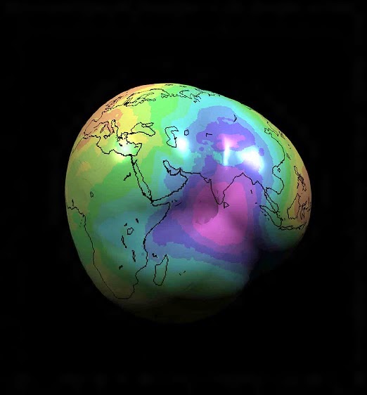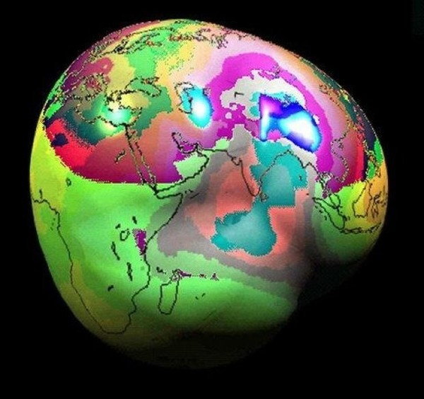 Абстрактная модель на изображении представляет иллюстрацию неравномерности силы гравитации, действующей на поверхности нашей планеты. Желтым цветом обозначены области, в которых сила гравитации выше, а синим — ниже, нежели средний глобальный показатель.