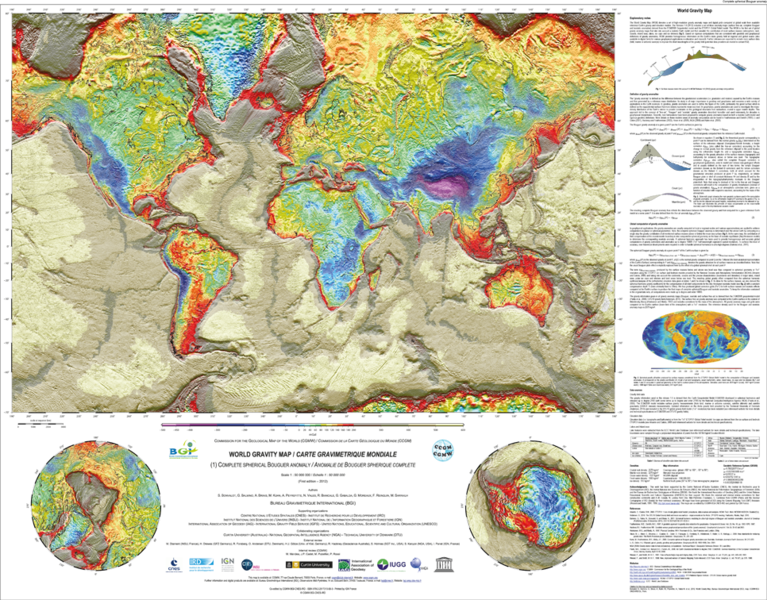 Обновление (июнь 2012 г.): публикация новых карт глобальных гравитационных аномалий (редакторы CCGM-BGI-CNES-IRD). Bureau Gravimétrique International (BGI), служба Международной геодезической ассоциации (IAG). Эти новые продукты, созданные для Комиссии по геологической карте мира (CGMW), ЮНЕСКО, Международного союза геодезии и геофизики (IUGG) и Международного союза геологических наук (IUGS), представляют собой первые карты гравитационных аномалий, рассчитанные в сферической геометрии. , которые учитывают реалистичную модель Земли. Карты гравитационных аномалий, представленные здесь (Бугер, изостатическая и приземная в свободном воздухе), получены из доступных моделей гравитации Земли (EGM2008, DTU10) и включают поправки на рельеф с высоким разрешением, которые учитывают вклад большинства поверхностных масс (атмосферы, суши, океанов, внутренних моря, озера, ледяные шапки и шельфовые ледники).