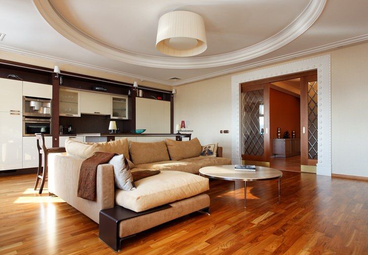 Использование единого покрытия полов поможет увеличить площадь маленькой квартиры и подчеркнуть общий масштаб больших комнат. Одинаковое покрытие приятнее воспринимается и не создает дискомфорта при пересечении разделенных зон.