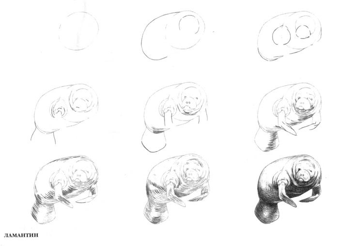 исунки животных для срисовки карандашом для начинающих поэтапноЧто бы части тела животных получились пропорциональными, начинать рекомндуется с туловища, затем шея, голова, лапы, уши и хвост. Затем прорисовываем детали. По желанию, рисунок можно раскрасить цветными карандашами.