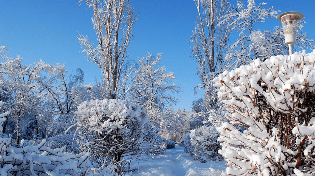 Заснеженные кусты и снегопад. Зима картинки. зимний пейзаж.