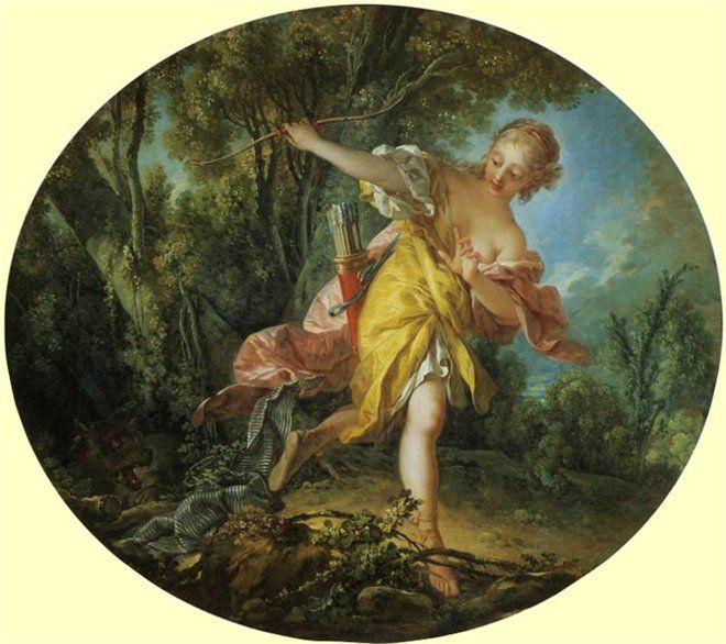 Франсуа как-то по-своему передавал античные мифы. Вот Юпитер, полюбивший нимфу Каллисто, решил явиться к ней в образе Дианы, богини охоты. Две очаровательные розовощекие девушки с оголенными плечами откровенно флиртуют, и в этом проявляется тончайший привкус дерзкой и вызывающей эротичности.