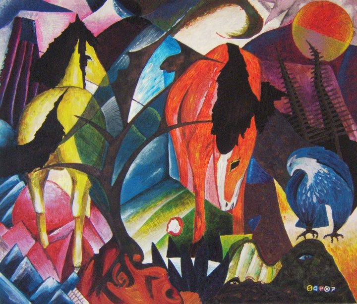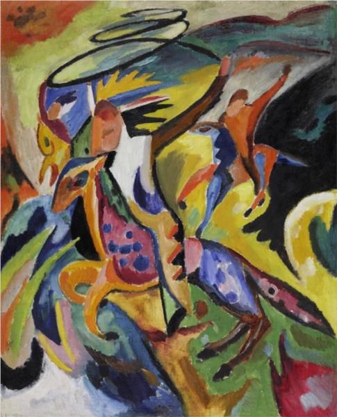 красочный, экспрессионистская живопись, август маке, животные, пейзаж с коровами и верблюдом, немецкий художник, der blaue reiter, винтаж