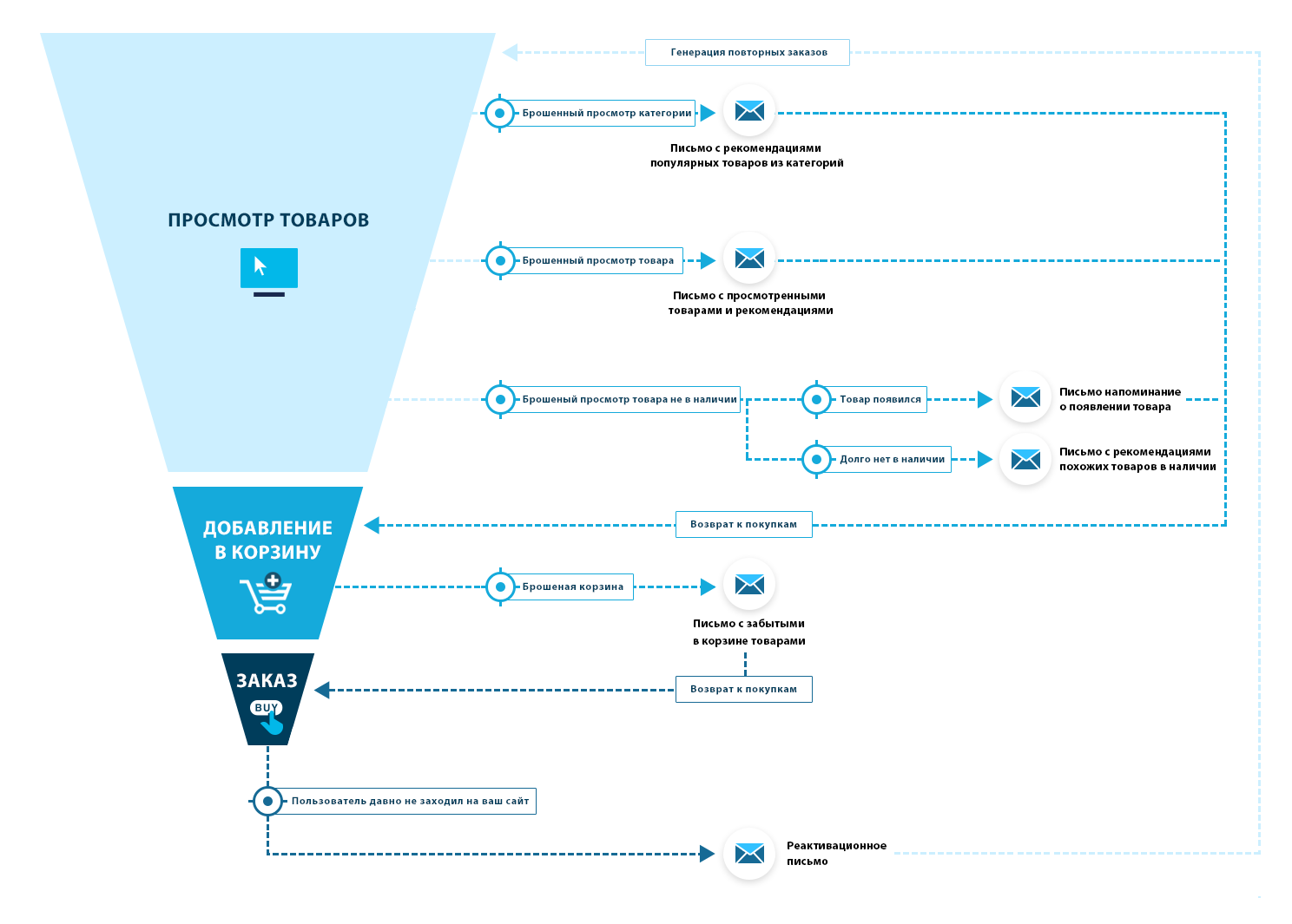 Любая аудитория требует внимания к себе, и чем очевиднее персонализирован подход к коммуникациям, тем лучше. Каждый клиент имеет свой жизненный цикл, скорость продвижения по этапам которого зависит от того, как давно и насколько успешно пользователь взаимодействует с магазином.