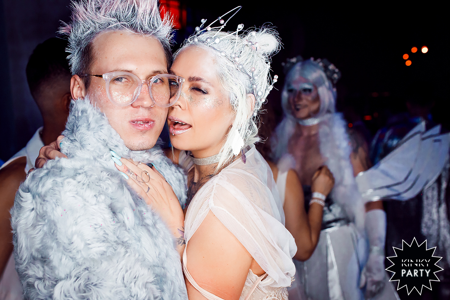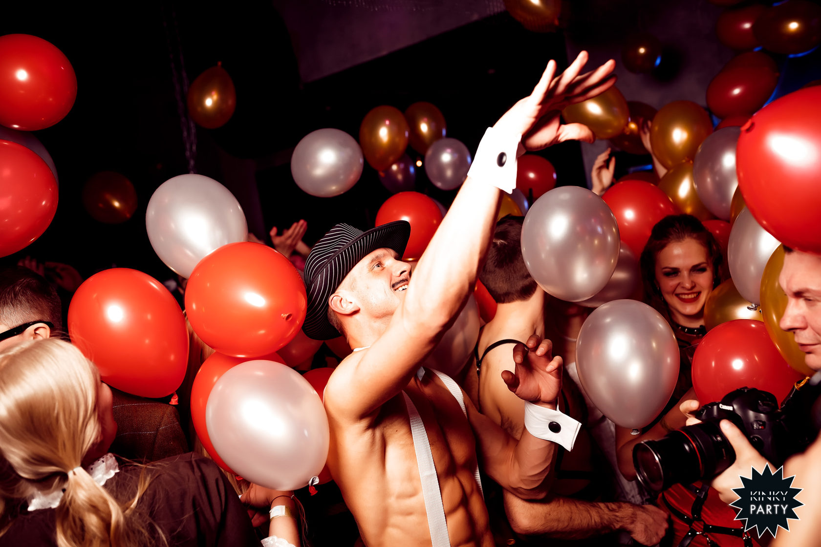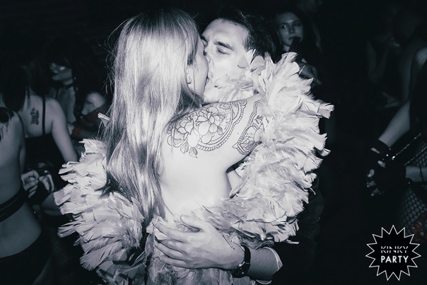 Основатели Kinky Party Таисия Решетникова и Таня Дмитриева. Кудрявый вечеринкаПраздник проходит в двухэтажном доме. На первом этаже люди отдыхают в баре с пивом, коктейлями и шотами. Это может быть обычная вечеринка, за исключением того факта, что многие из посетителей частично или полностью обнажены — женщины в большей степени, чем мужчины — и что пары и тройки страстно целуются.