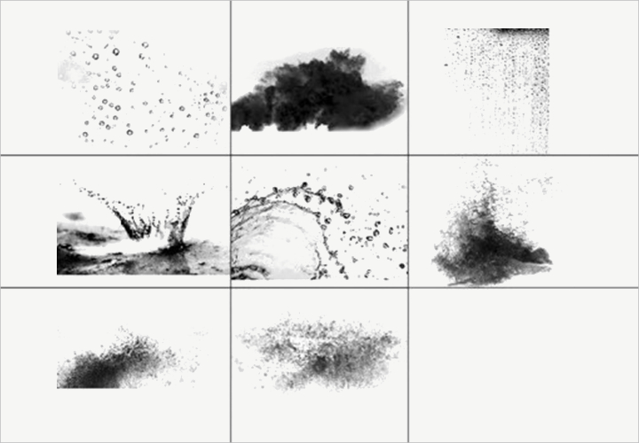 В следующем наборе кистей вы также получите набор из семи кистей-всплесков, созданных в Photoshop CS3. Он также включает в себя эффекты капель и ряби воды.