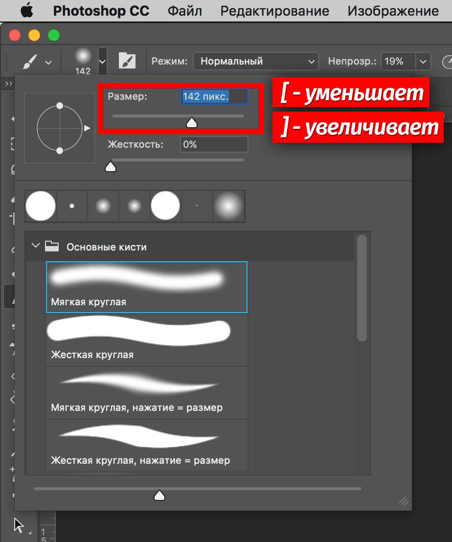 Чтобы просмотреть загруженных предустановок , щелкните Кисти в верхнем левом углу панели.Измените параметры для предустановленной кисти . Временно меняет размер кисти на . Перетащите ползунок или введите значение.