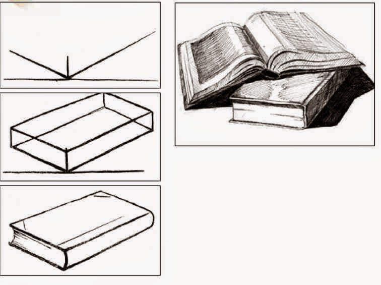 Первый шаг — нарисуйте контур книги. Используя справочник, вы можете начать с передней, боковой или верхней перспективы.