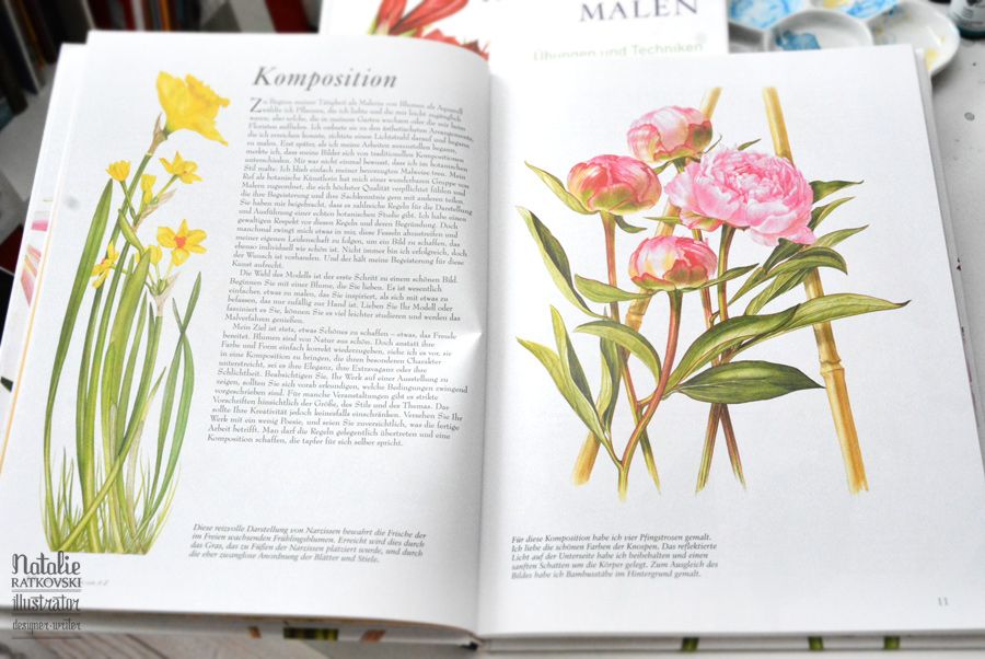 Он содержит советы и приемы, например, как сохранить свежесть стеблей при рисовании с натуры. Эта книга похожа на практическое руководство по всем вещам, которые вы когда-либо хотели рисовать, например, как удалить налет, или как создать колючую поверхность, или какую кисть использовать. Смесь нарциссов великолепна, а фиолетовый и черный великолепно переданы. Отличный путеводитель для всех, кто любит ботаническую живопись.