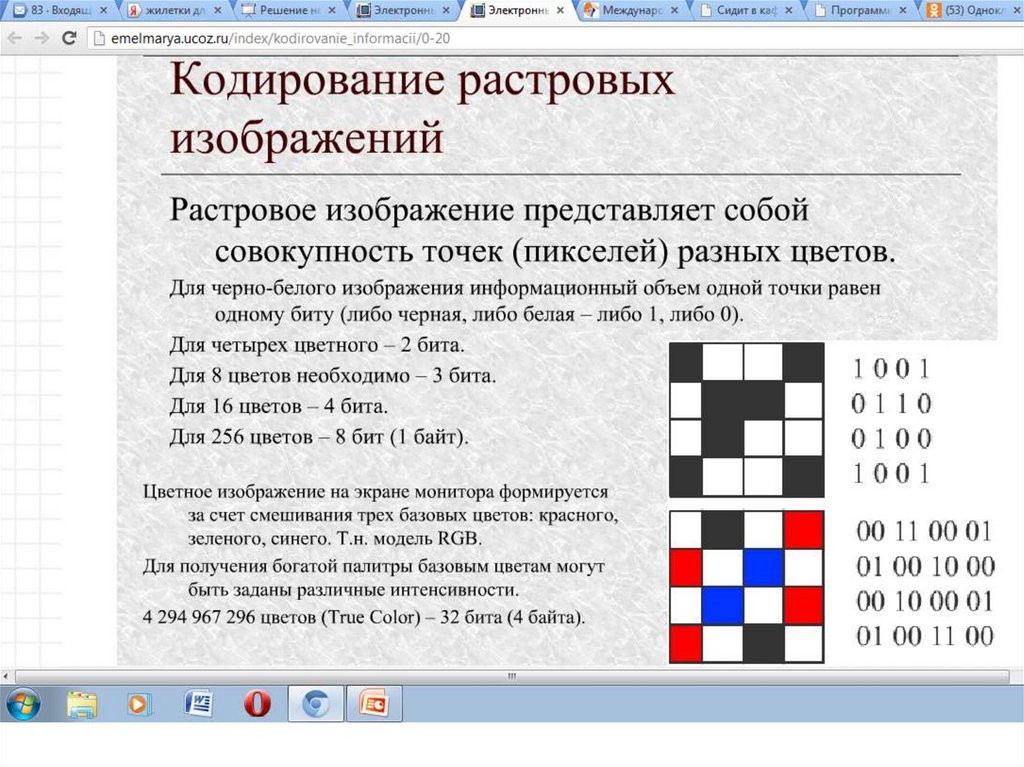 1) Модель HSB характеризуется тремя компонентами: оттенок цвета(Hue), насыщенность цвета (Saturation) и яркость цвета (Brightness). Можно получить большое количество произвольных цветов, регулируя эти компоненты. Эту цветовую модель лучше применять в тех графических редакторах, в которых изображения создают сами, а не обрабатывают уже готовые. Затем созданное свое произведение можно преобразовать в цветовую модель RGB, если ее планируется использовать в качестве экранной иллюстрации, или CMYK, если в качестве печатной, Значение цвета выбирается как вектор, выходящий из центра окружности. Направление вектора задается в угловых градусах и определяет цветовой оттенок. 2) Принцип метода RGB заключается в следующем: известно, что любой цвет можно представить в виде комбинации трех цветов: красного (Red, R), зеленого (Green, G), синего (Blue, B). Другие цвета и их оттенки получаются за счет наличия или отсутствия этих составляющих.По первым буквам основных цветов система и получила свое название — RGB. Данная цветовая модель является аддитивной, то есть любой цвет можно получить сочетание основных цветов в различных пропорциях. При наложении одного компонента основного цвета на другой яркость суммарного излучения увеличивается. Если совместить все три компоненты, то получим ахроматический серый цвет, при увеличении яркости которого происходит приближение к белому цвету. 3) Принцип метода CMYK. Эта цветовая модель используется при подготовке публикаций к печати. Каждому из основных цветов ставится в соответствие дополнительный цвет (дополняющий основной до белого). Получают дополнительный цвет за счет суммирования пары остальных основных цветов. Значит, дополнительными цветами для красного является голубой (Cyan,C) = зеленый + синий = белый — красный, для зеленого — пурпурный (Magenta, M) = красный + синий = белый — зеленый, для синего — желтый (Yellow, Y) = красный + зеленый = белый — синий. Причем принцип декомпозиции произвольного цвета на составляющие можно применять как для основных, так и для дополнительных, то есть любой цвет можно представить или в виде суммы красной, зеленой, синей составляющей или же в виде суммы голубой, пурупурной, желтой составляющей. Режим High Color — это кодирование при помощи 16-разрядных двоичных чисел, то есть уменьшается количестко двоичных разрядов при кодировании каждой точки. Но при этом значительно уменьшается диапазон кодируемых цветов. При индексном кодировании цвета можно передать всго лишь 256 цветовых оттенков. Соответствие между количеством отображаемых цветов (К) и количеством бит для их кодировки (а) находиться по формуле: К = 2а. Двоичный код изображения, выводимого на экран, хранится в видеопамяти. Видеопамять — это электронное энергозависимое запоминающее устройство. Размер видеопамяти зависит от разрешающей способности дисплея и количества цветов. Но ее минимальный объем определяется так, чтобы поместился один кадр (одна страница) изображения, т.е. как результат произведения разрешающей способности на размер кода пикселя Vmin = M * N * a Шестнадцатицветная палитра позволяет увеличить количество используемых цветов. При раздельном управлении интенсивностью основных цветов количество получаемых цветов увеличивается. Так для получения палитры при глубине цвета в 24 бита на каждый цвет выделяется по 8 бит, то есть возможны 256 уровн