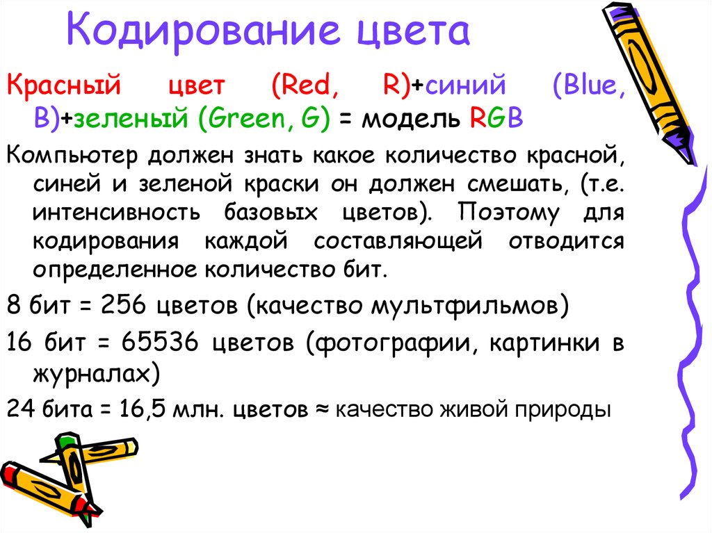 Для того чтобы компьютер имел возможность работать с цветными изображениями, необходимо представлять цвета в виде чисел — кодировать цвет. Способ кодирования зависит от цветовой модели и формата числовых данных в компьютере.