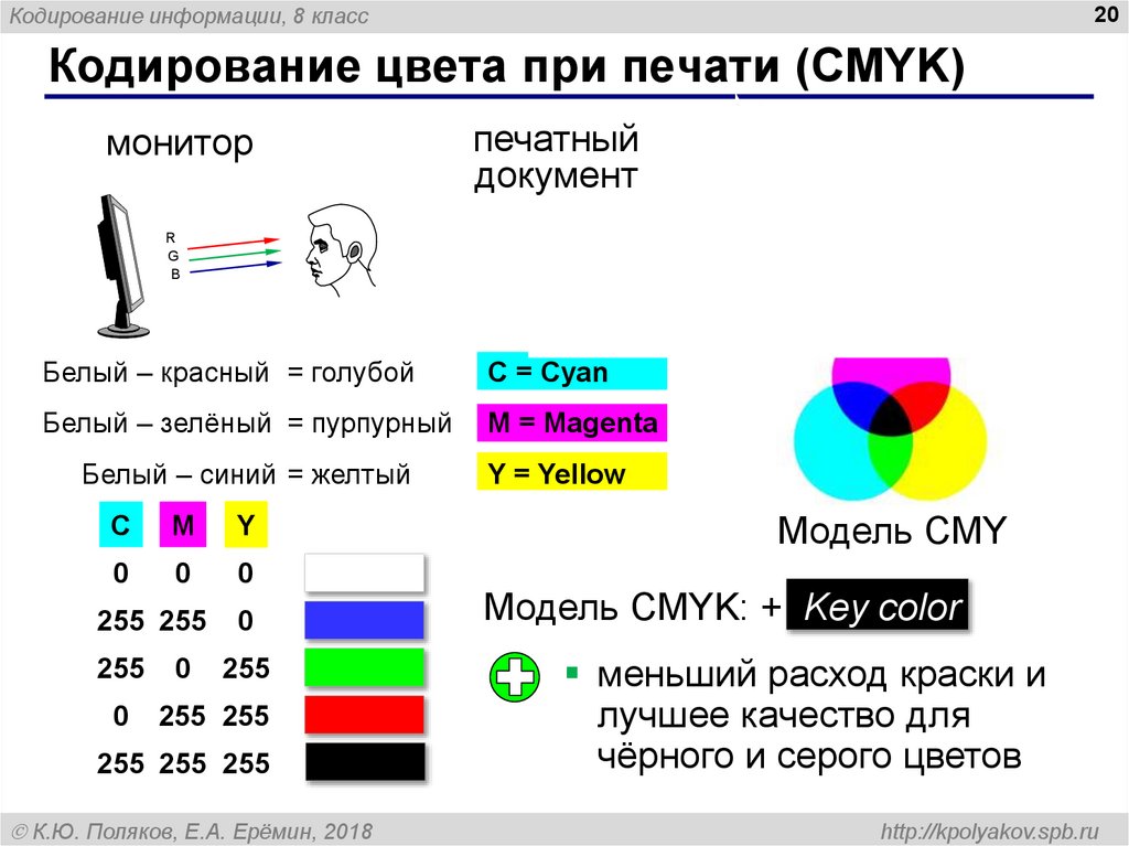 В основном такой метод принят в полиграфии. Но там еще используют черный цвет (BlacК, так как буква В уже занята синим цветом, то обозначают буквой K). Это связано с тем, что наложение друг на друга дополнительных цветов не дает чистого черного цвета.