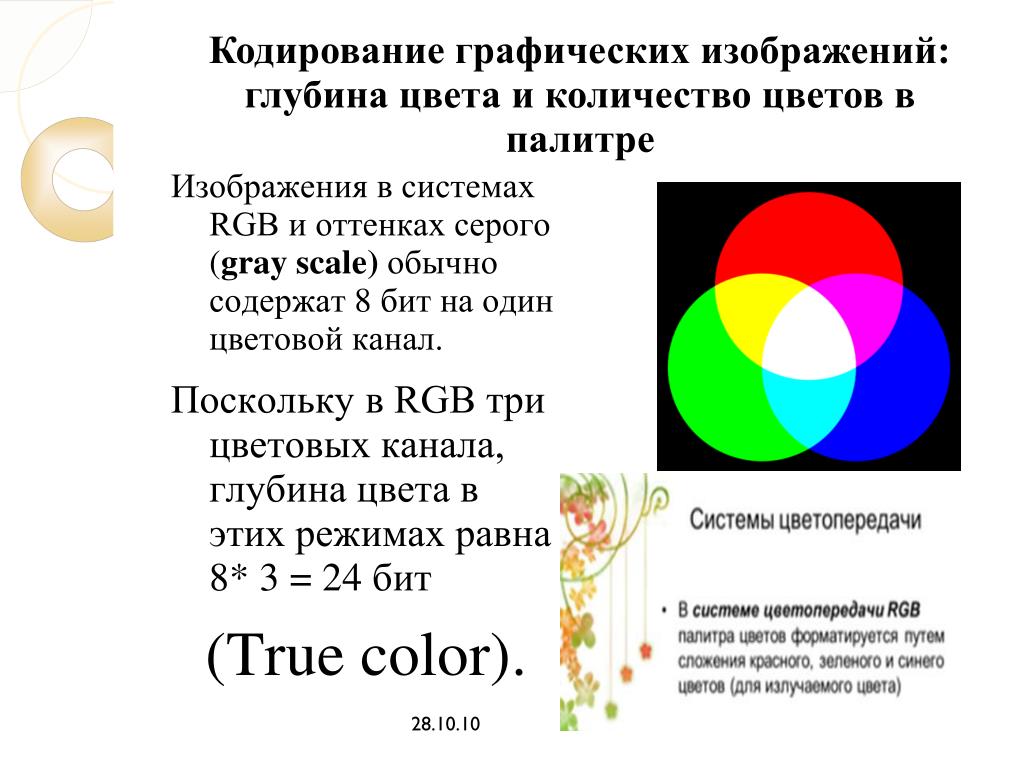 В настоящее время достаточно распространенным является формат True Color, в котором каждый компонент представлен в виде байта, что дает 256 градаций яркости для каждого компонента: R=0…255, G=0…255, B=0…255. Количество цветов составляет 256х256х256=16.7 млн (224).