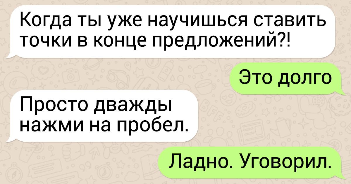 По множественным исследованиям британских ученых было доказано, что точки в конце предложения ставят никто иные, как люди, у которых завышенной чувство собственной важности (ЧСВ). «Я грамотный, а ты — нет», — думают они, видя плебеев без точек в конце. Также, я раньше тоже ставил точки в конце предложения потому, что так сообщения просто выглядят более серьёзно. Вот… Читать далее
